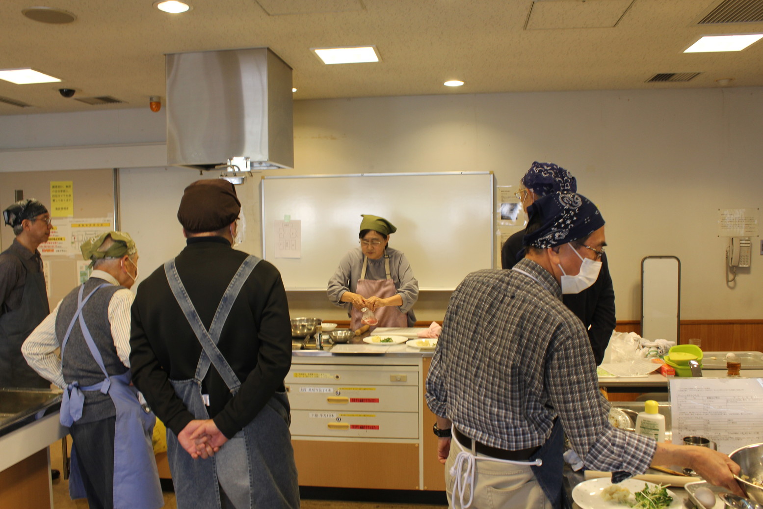 今回のメイン料理は、肉じゃがでした。皆様に失敗せずに美味しくできる方法を、お伝えしました。定年退職後、奥様の料理負担を軽減したいという目的で、参加されている方も多く、「肉じゃがという普段よく作る料理に、自信が持ちたい」というご要望にお応えすることが出来たと思います。まずは、包丁で野菜を切るのですが、包丁に慣れてない方が優先的に包丁に触れていただくように、しています。
