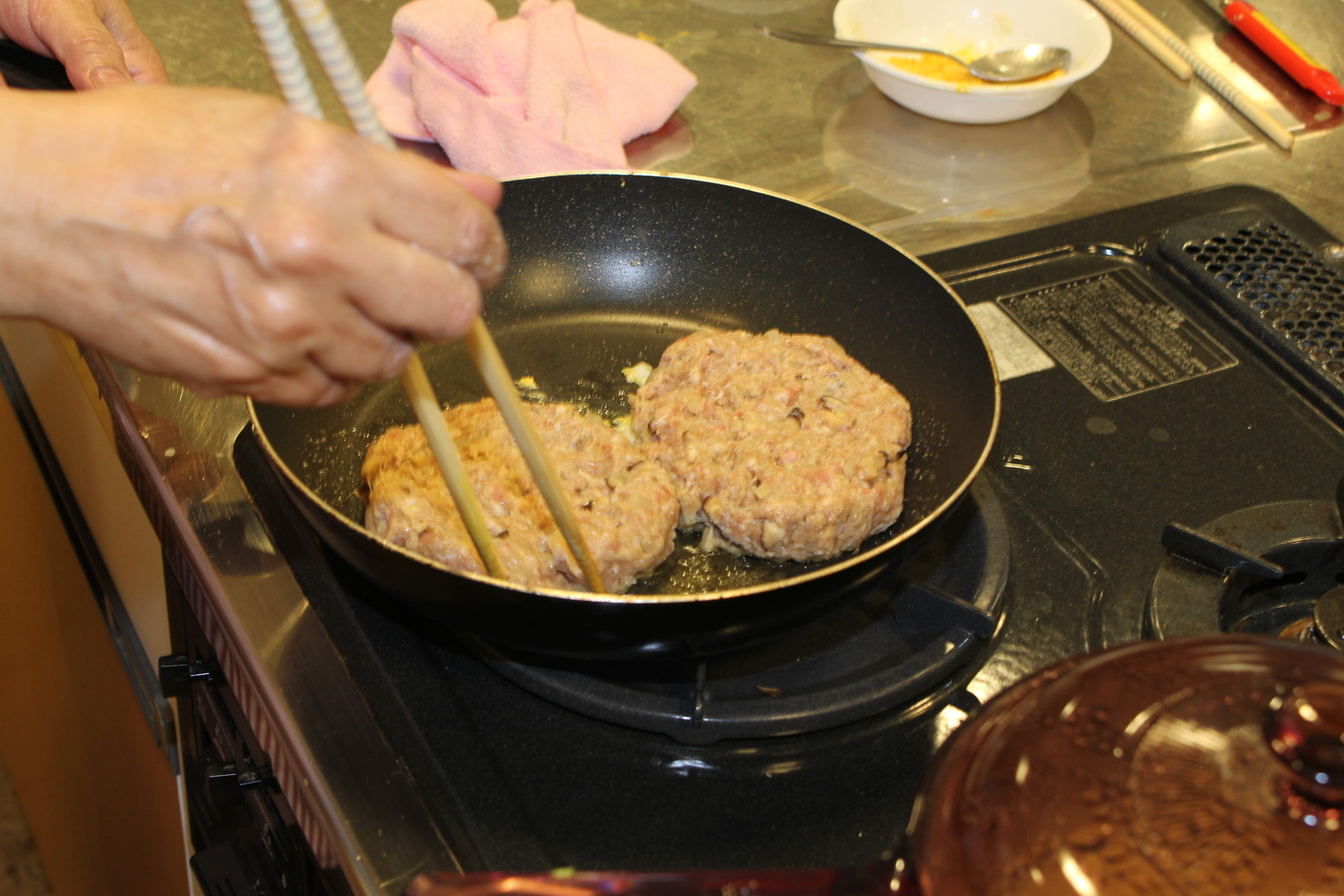 今回時短のアイディアは肉ダネの玉ねぎは炒めず、電子レンジにかけました。肉ダネに干ししいたけのみじん切りを入れるのが美味しさアップの秘けつです。よく粘りが出るまでこねて、フライパンで焼きます。中までしっかり火が通るように、ワインやトマトケチャップ等を入れた煮汁で煮て、煮汁を煮詰めて行きます。