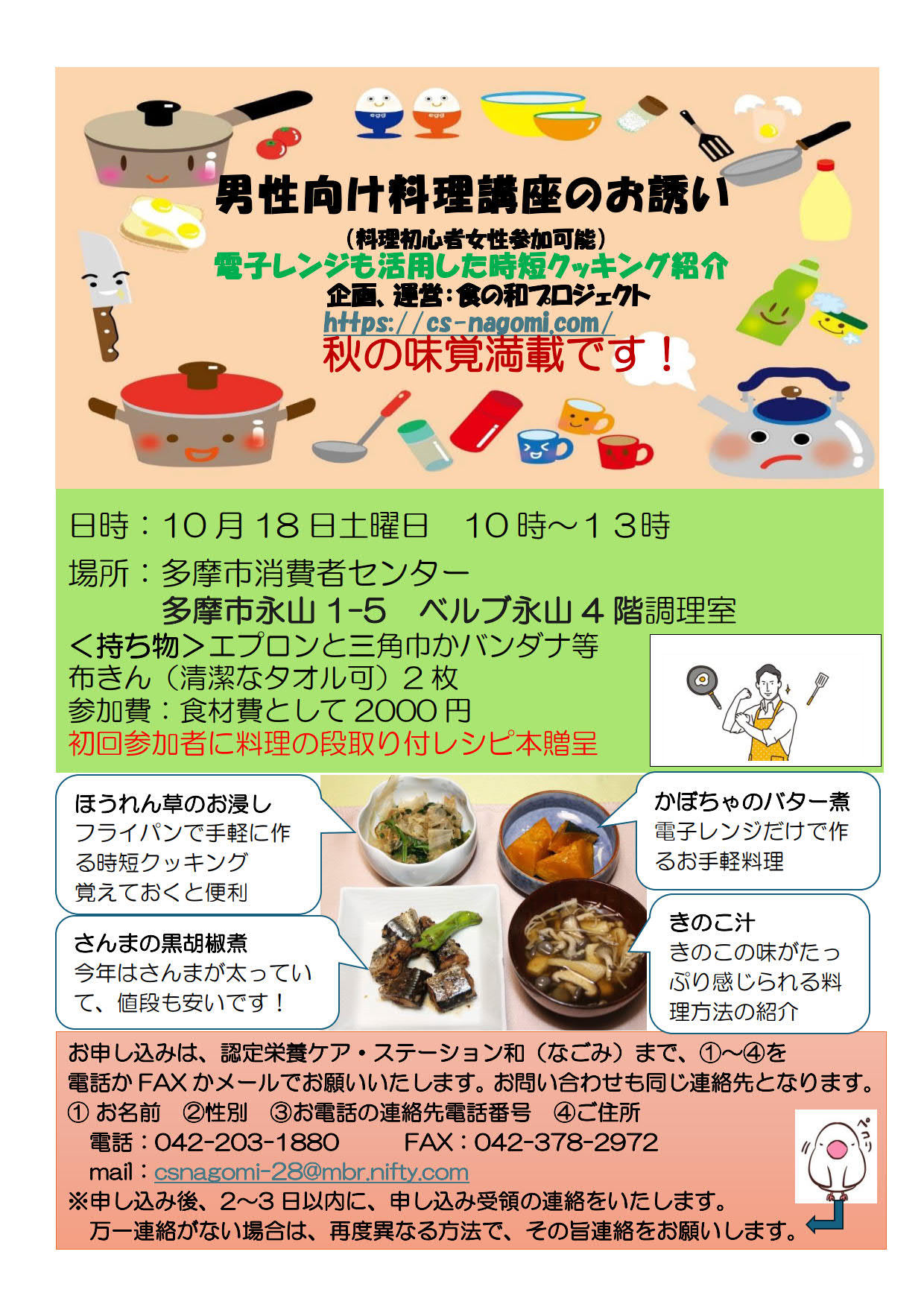 連絡先は認定栄養ケア・ステーション和(なごみ)まで 電話:042-203-1880 メールアドレス csnagomi-28@mbr.nifty.com
