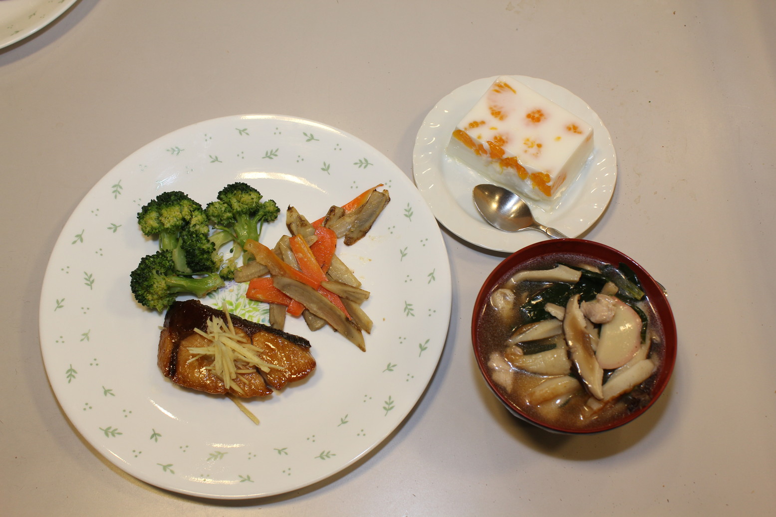 次に、ぶりの照り焼きです。ぶりは薄く小麦粉を付けて、フライパンで焼き、最後にしょうゆとみりんを絡めて作る方法です。減塩で作れる照り焼きです。