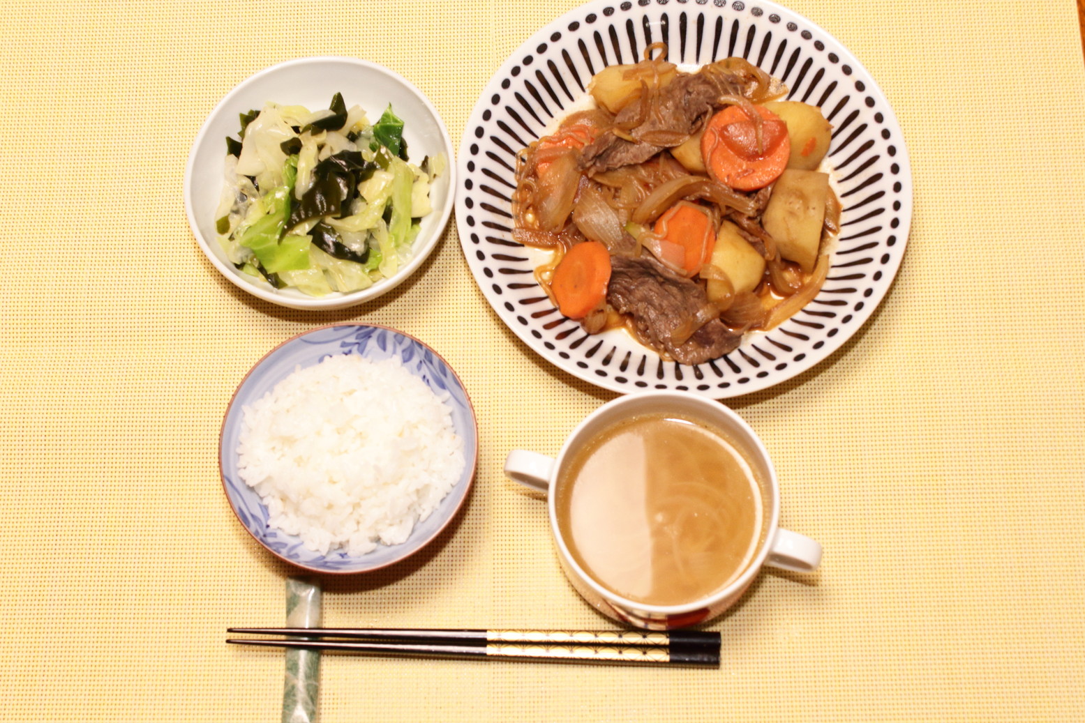 次回は、肉じゃがを中心とした、料理をいたします。肉じゃがは、フライパンで肉をちょっとだけ炒めて、あとの肉は野菜の上に乗せて、蒸し焼きにします。野菜の上に乗せた肉は、柔らかい状態で仕上がり、美味しくできます。フライパン蒸しの場合、じゃがいもやにんじんに上手に火が通るためには、電子レンジで下処理をします。そんな工夫をするので、どなたでも、失敗なく美味しくできます。土井善晴先生の作り方に一工夫加えました。是非覚えて、ご家庭でお楽しみください。