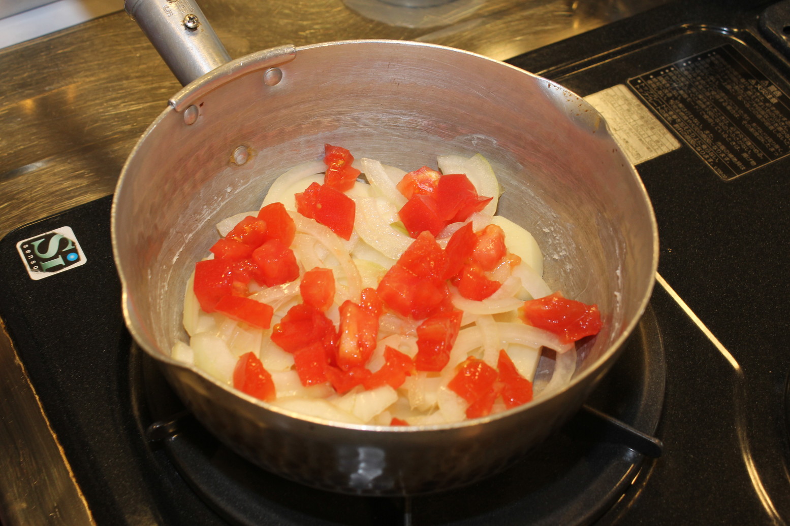 副菜はじゃがいもと玉ねぎとトマトの重ね煮です。鍋の中でスライスしたじゃがいも、玉ねぎ、トマトを順番に2回ずつ積み重ねて作ります。