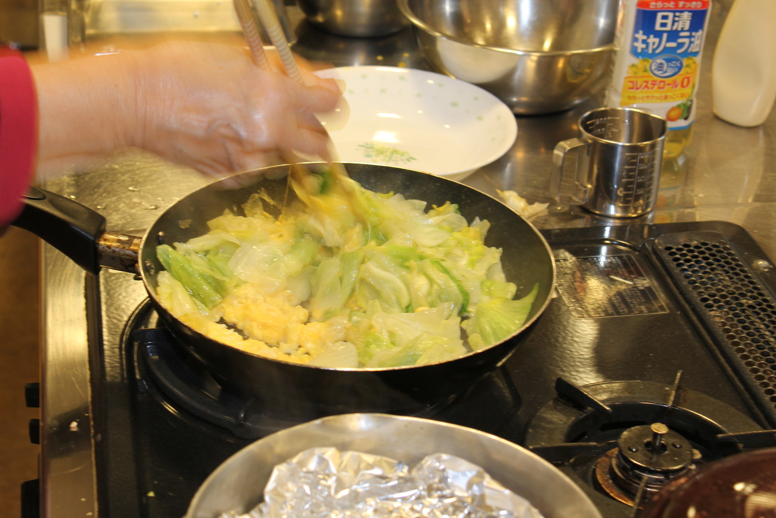 メイン料理が少しボリューム不足でしたので、添え野菜は簡単に冷凍のさやいんげんを炒めてと思っていたのを変更し、レタスと卵の炒め物に致しました。レタスはふだんは安くて購入しても、生のままではなかなか食べきれません。しかし、炒めると一人分1/4玉は食べることが出来ます。歯ごたえもよく、食べ応えもあります。ふだんの朝食などにも、使っていただける料理です。